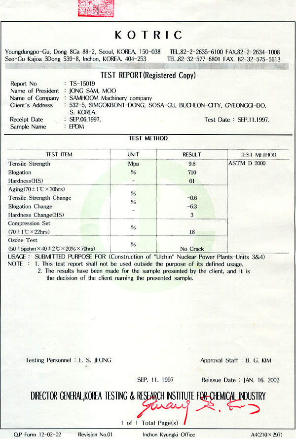| 2 | Gasket 認證測試 | ASTM D2000 | Korea Testing and Research Institute for Chemical Industry | 1997. 09. 06