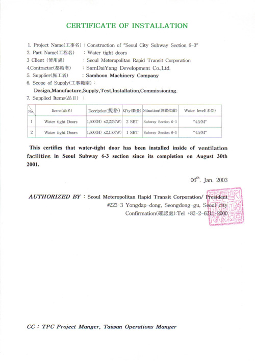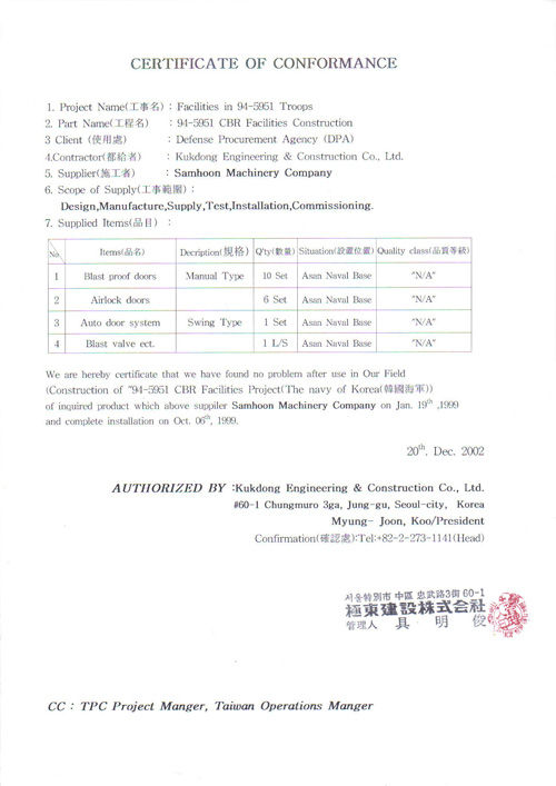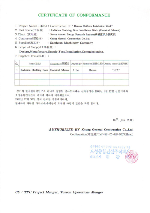 Certificate of Conformance (Hanaro Plant) view