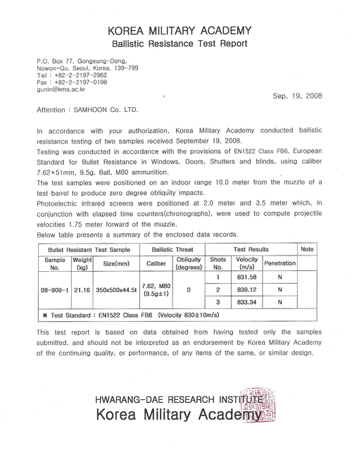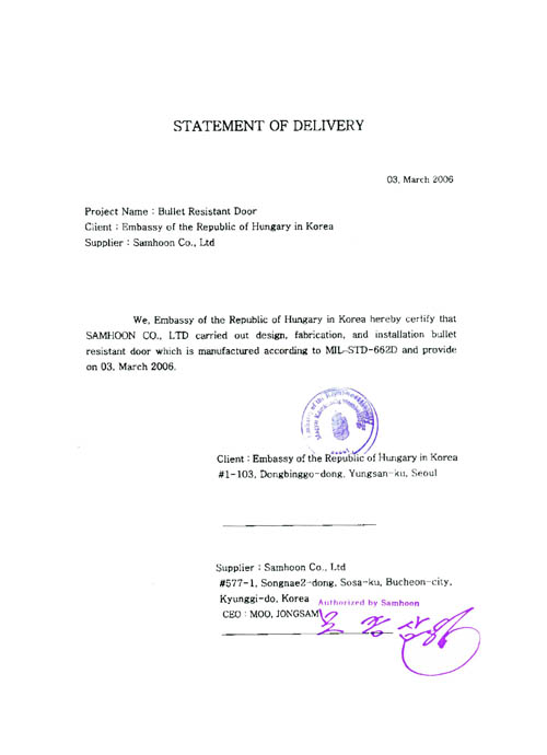 Acquired Certification of UL 752 Level 8(Bullet Resistant Door) view