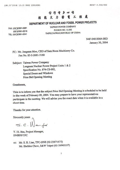 Vendor Approve of TAIWAN POWER COMPANY view